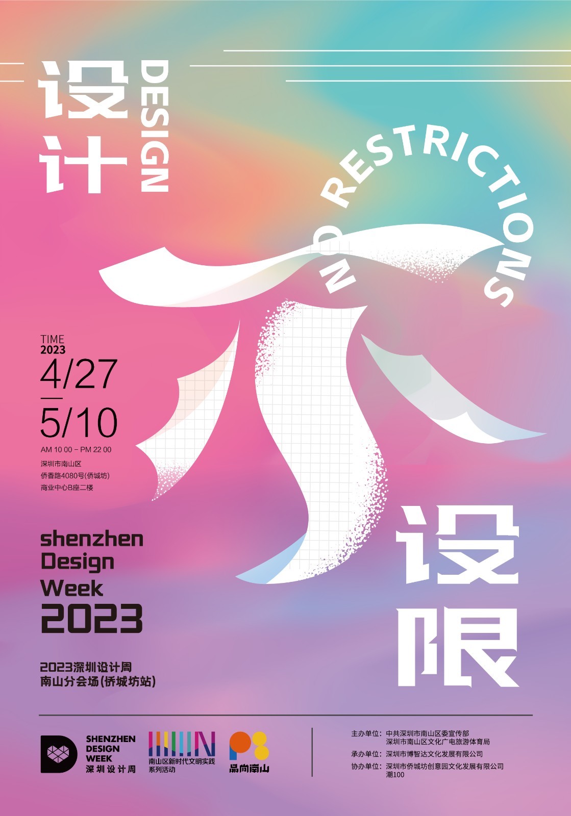 此次展览由中共深圳市南山区委宣传部、南山区文化广电旅游体育局主办,深圳市博智达文化发展有限公司承办,深圳市侨城坊创意园文化发展有限公司、潮100协办,以“设计不设限”为主题,结合城市特质及设计本质,展出新鲜的、潮流的、具有创意的运动类、潮玩类和科技性的设计,让世界看到深圳蓬勃发展的设计创造力,南山浓厚的艺术潮流底蕴及大湾区强劲的科技能力。