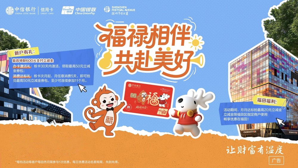 在中秋国庆双节期间,中信银行信用卡与中国银联、深圳节日大道,联合推出“食住行娱购 优惠在福田”主题消费活动。同期,中信银行信用卡联动福田文旅人气IP“福气家族”,为市民及游客带来线下“福气站台”,消费者在打卡体验的同时,可深度了解商圈消费优惠活动,并获享“即申即办即享”的一站式场景服务,打造贯通餐饮、购物、娱乐、交通等多元消费场景的优质体验,进一步助力福田区提升消费活力,打造深圳消费旅游特色新名片。