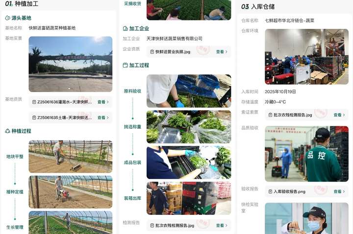 为保障这份极致新鲜看得见、信得过,京东七鲜同步上线了自研的“食安品质全链路”溯源系统,进一步将新鲜蔬菜为代表的食品安全透明化、可视化。消费者只需点击七鲜APP或小程序商品首页左下角的“全程溯源”,即可清晰追溯“24小时菜”从基地到门店的完整流通过程,一键了解蔬菜基地资质、农残检测报告、物流运输信息、入库验收报告等各类食品安全关键信息。