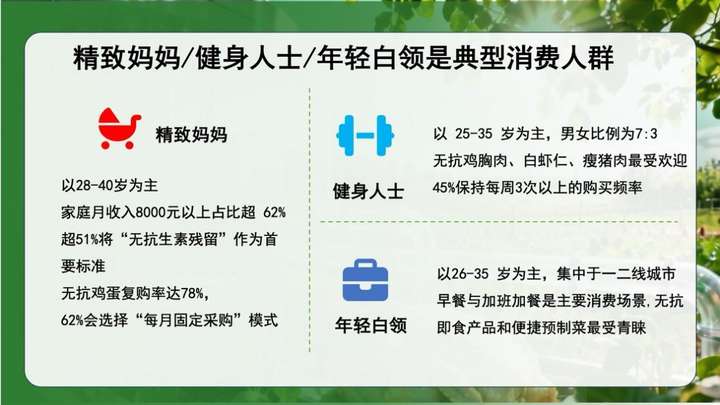 健身人士则将无抗鸡肉视为补充蛋白质的优质选择,选购无抗食品的男性和女性占比分别为70%和30%,他们将“无抗生素残留”与“高蛋白”“低糖”并列为选购核心标准,超40%的健身者明确表示“只选择无抗肉类补充蛋白”。