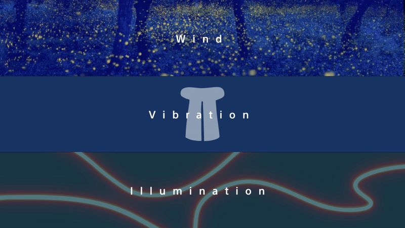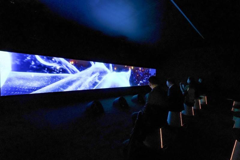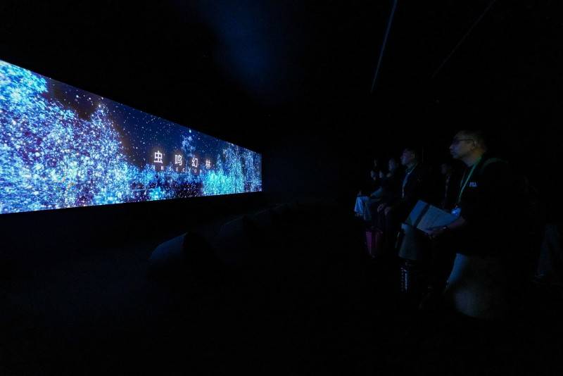 今年,索尼将参观者面前的这块屏幕升级为横10米、纵1.5米的“超宽屏”,结合中国山水画“借景”手法,融入自然景观、周边水域及群山等元素,创造出空间的延展感与纵深感。同时不再使用实拍与动画形式,与RED团队合作进行数字艺术创作,融合“昆虫有机生命律动”与“光粒子编织的精密数字世界”,打造原创影像作品。除此之外,配套的“风”、“振动”与“照明”相辅相成,还原了骑乘在昆虫背部的感受与类似蜻蜓复眼所见的奇幻色彩。