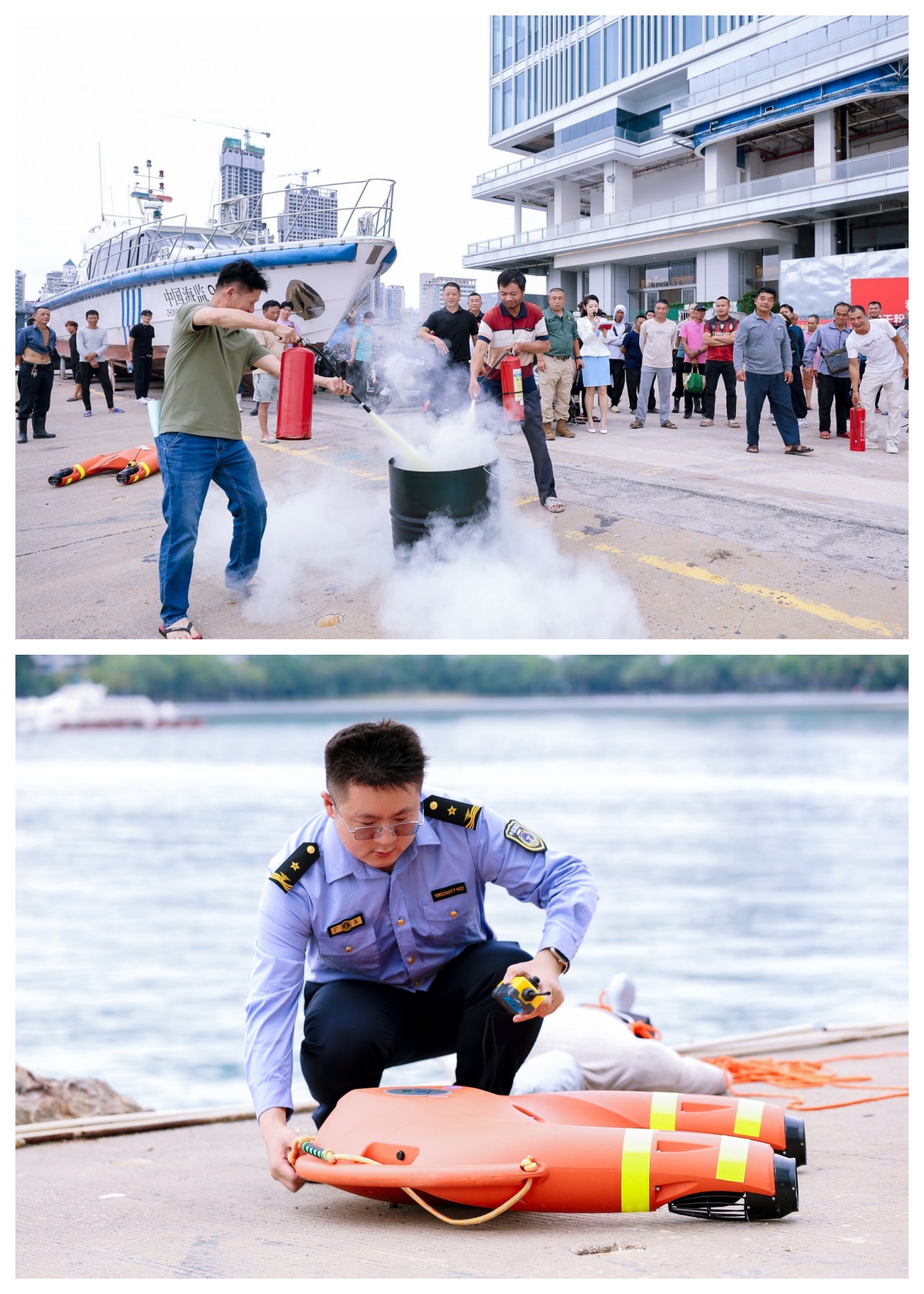 实操演练环节作为本次活动的核心环节,南山管理局针对性设置了差异化演练内容,模拟落水救援、船舶火灾等突发场景分组开展救生衣快速穿脱、救生圈精准投掷、手提式灭火器规范操作三大科目的实操演练。专业讲师在实操演练过程中“手把手”指导,纠正不规范动作,确保参训渔民熟练掌握自救互救关键技能,应急处置能力得到实质提升。此外,执法人员还展示了智能水上机器人救援演练,模拟人员落水紧急情况,机器人以高速模式赶赴“落水点”,低速调整位置后安全拖带“落水者”返航,充分彰显了智能化装备在提升救援效率、保障执法安全中的重要作用。