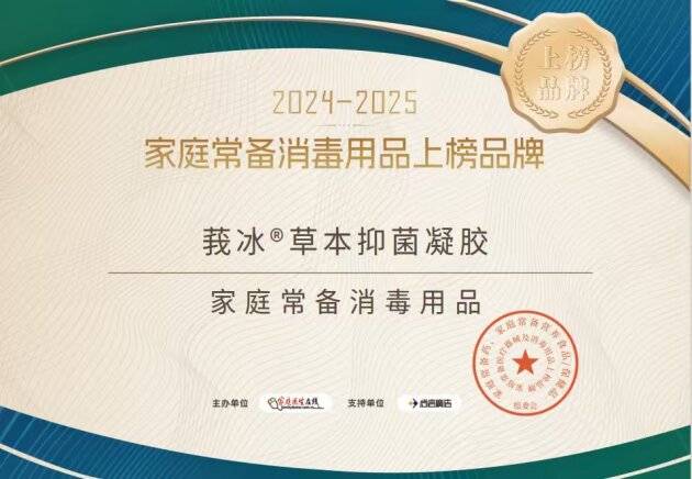 在此评选中,回元堂莪冰®草本抑菌凝胶凭借深厚的行业积淀、可靠的产品品质与广泛的市场认可,一举斩获“2024-2025家庭常备医疗器械与消毒用品上榜品牌”。