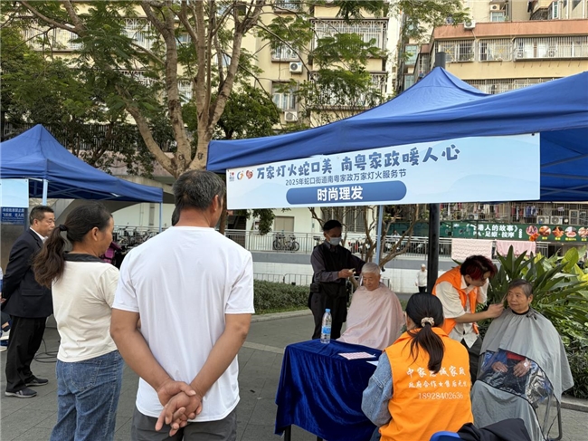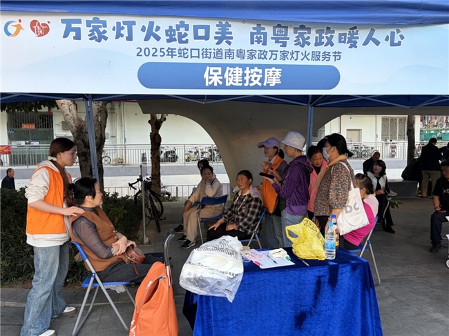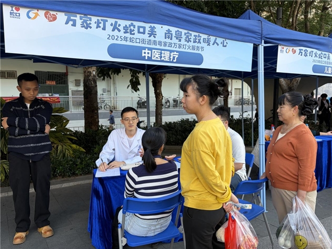 2025年12月9日下午,在蛇口东角头地铁站A出口外的广场支起了一排蓝色帐篷,12张长桌、50把塑料凳依次摆开,视力检查、口腔义诊、中医理疗、时尚理发、匠心补鞋、衣物缝补、儿童手工、手机贴膜等12个摊位沿广场内侧呈“一”字形排开火热开市,此外留出过道方便轮椅进出。