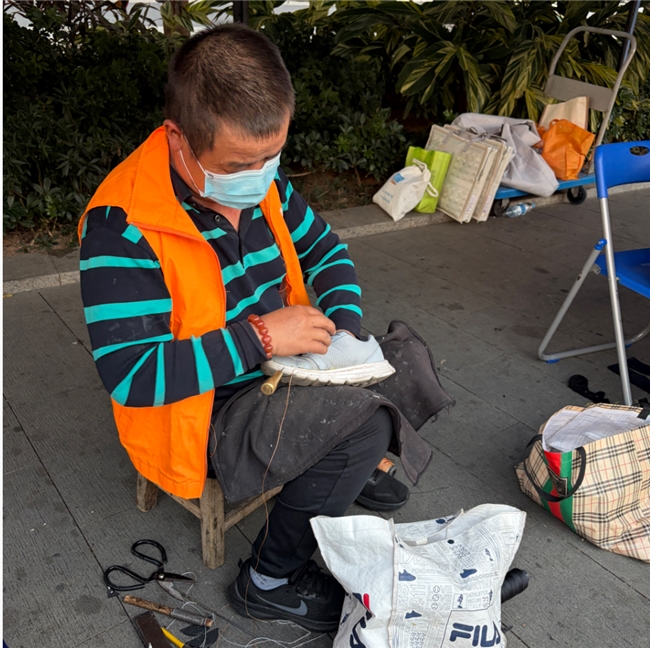 匠心补鞋和衣物缝补两个摊位紧挨着,由蛇口街道再就业群体的技师坐镇。补鞋师傅熟练地用左手固定鞋底,右手穿针引线,10分钟把一双开口的布鞋缝牢。“补的不只是鞋,更是老蛇口的记忆!”补鞋师傅的一句话引来点赞无数。缝补区的大叔用缝纫机帮居民改裤脚,每一份都精心做好,居民惊喜地说“修改得真不错呀”。
